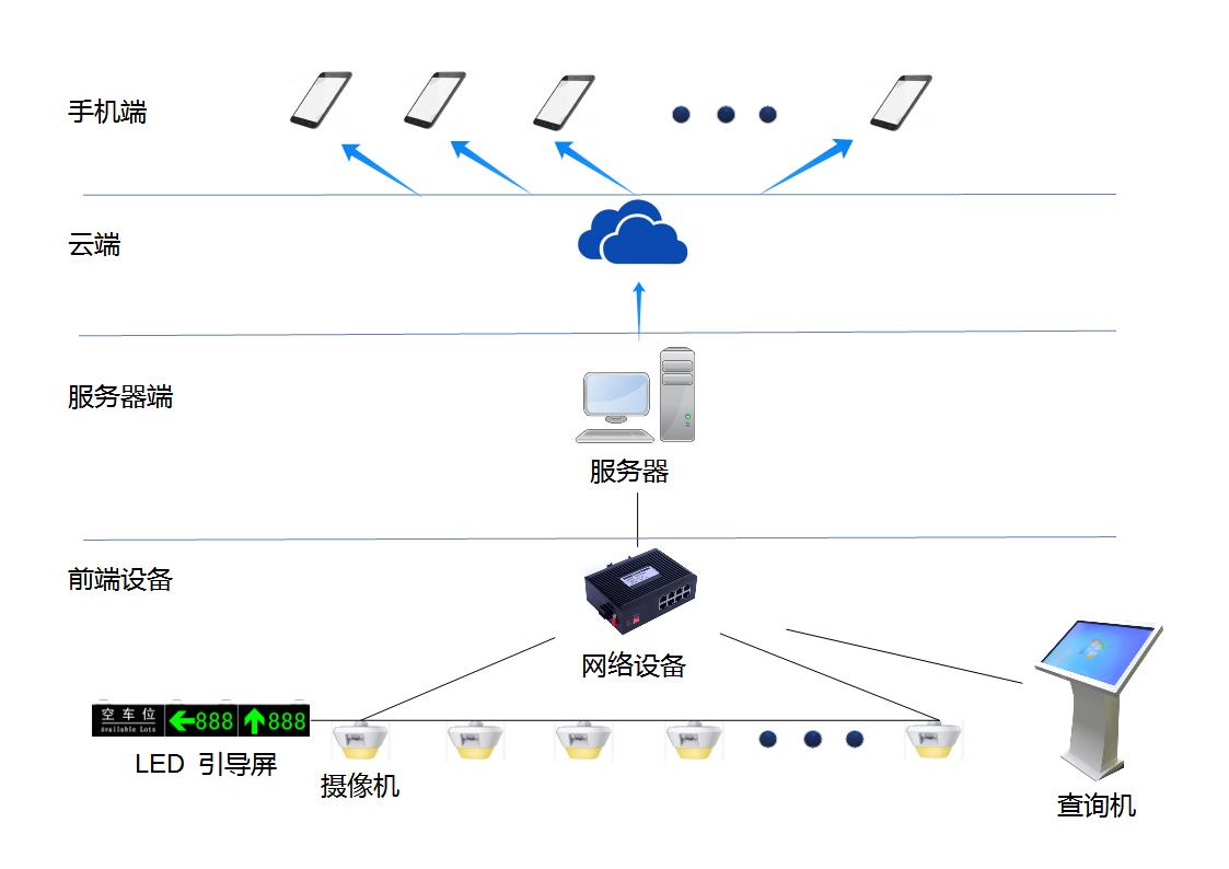 系统主要由车牌识别摄像机、查询机、引导屏、交换机、服务器、软件等组成。