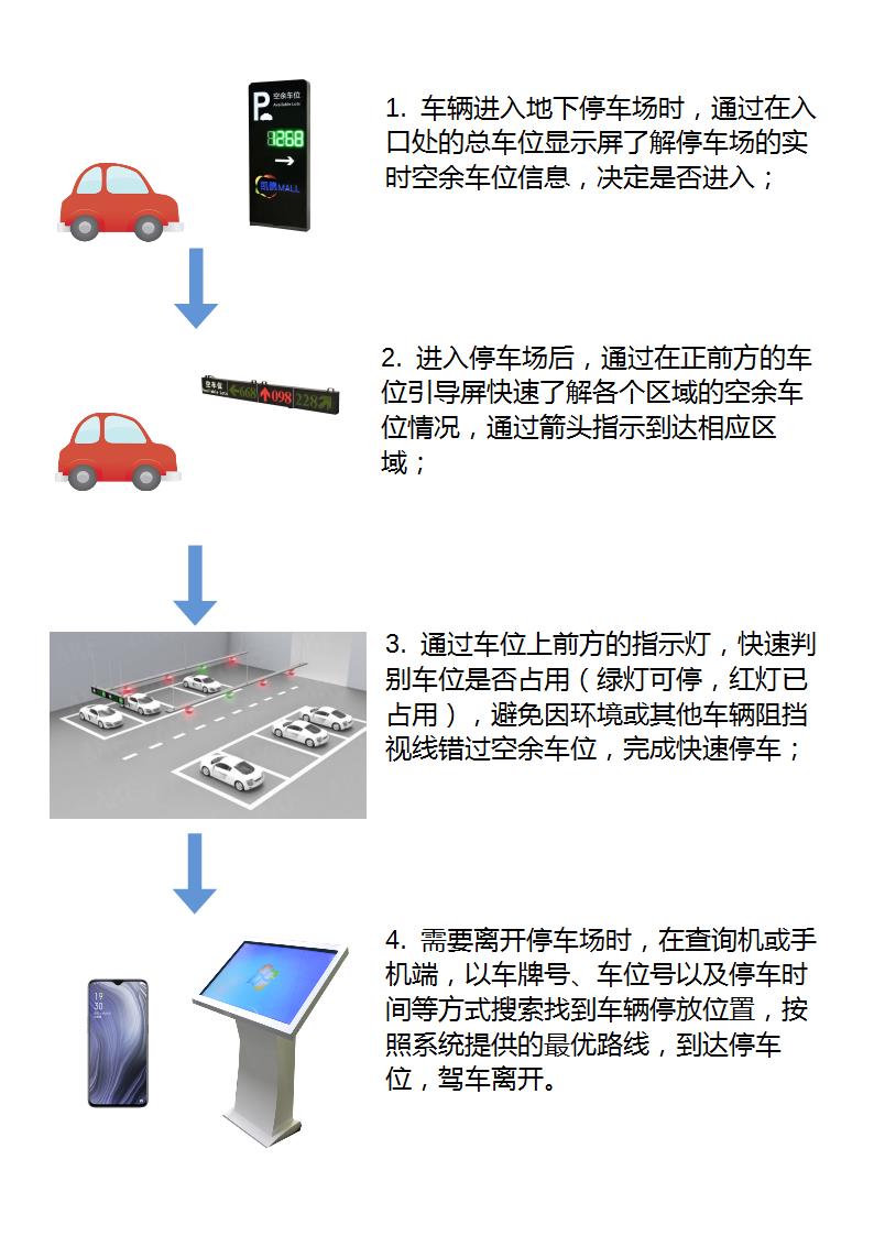 控制显示屏,引导车主以最短的时间进入空闲车位,提高停车场的使用率、优化停车环境,提高客户满意度;