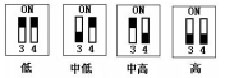 灵敏度调节使用面板上的拔码开关DIP34,共有四级。具体设置见下图。在试运行时,先将灵敏度设在较低档,在实际测试后如果车辆检测无输出,则应将灵敏度调高一档,如此反复,直至车辆检测器正常、稳定工作(默认DIP3|4 = ON|OFF中高档)。